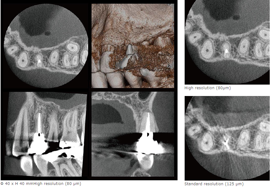 FOV Φ40xH40の撮影では、ボクセルサイズ80µm、2.5LP/mm以上の高解像度CT撮影を実現しました。上の例では、125µm画像に比べ80µm画像の方が、アーチファクトが少なく、鮮明に描出しています。